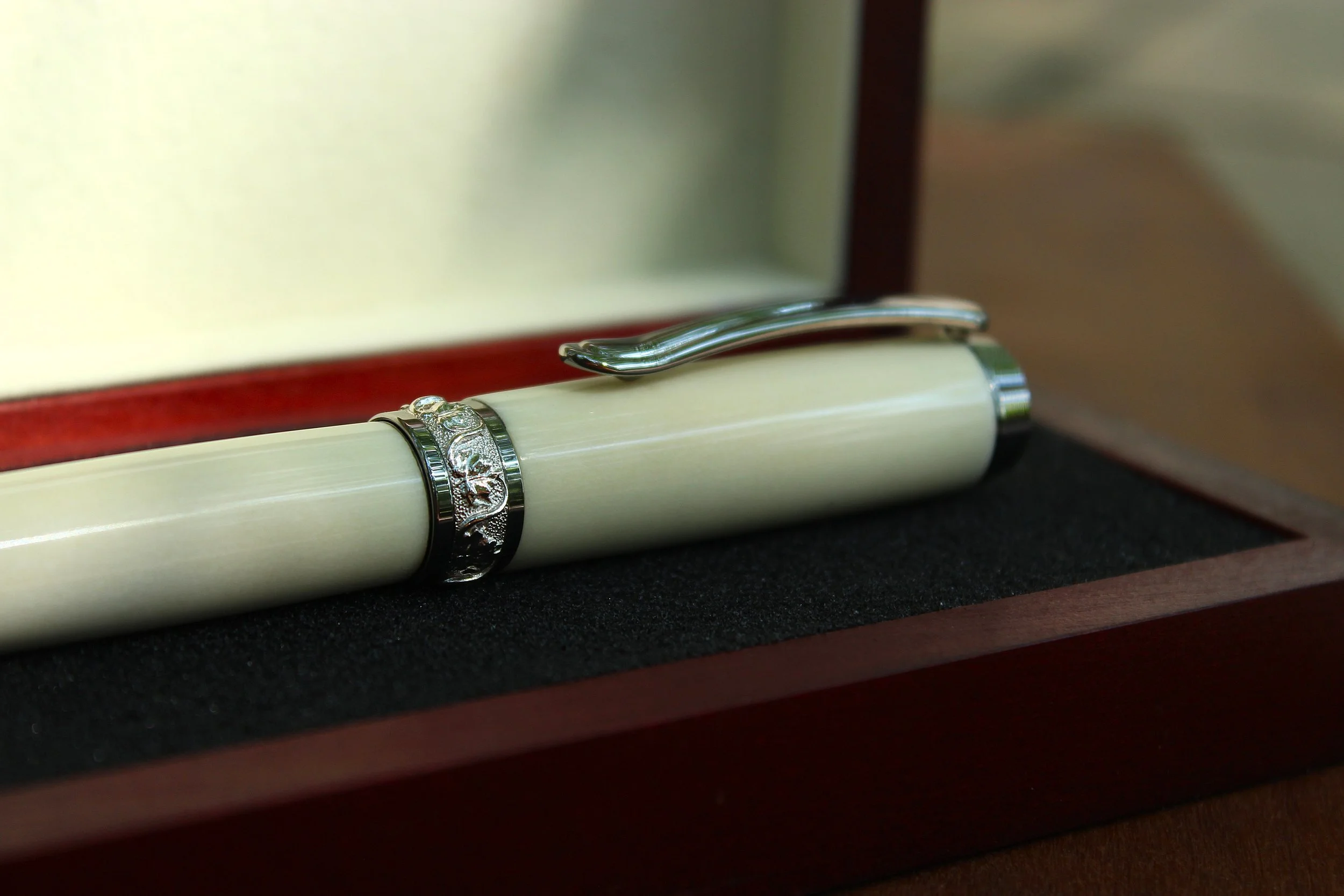 These writing instruments are crafted by hand and designed to be an artistic expression for the owner. A pen to be used for that special contract, or a conversation piece to be displayed on a desk. They are equipped with a Schmidt ceramic rollerball for effortless writing, or they can be outfitted with a Montblanc ink cartridge. The pens are delivered in a cherry wood box for a nice presentation.